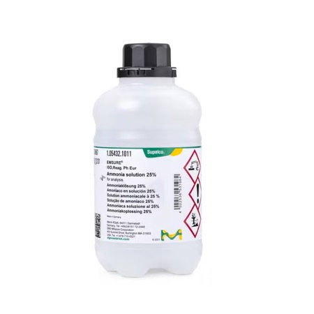 Ammonia solution 25% for analysis (EMSURE® ACS, ISO, Reag. Ph Eur) is a high-purity aqueous reagent used for pH adjustment, precipitation of metal hydroxides, and as a versatile alkaline cleaning and etching agent in analytical laboratories.