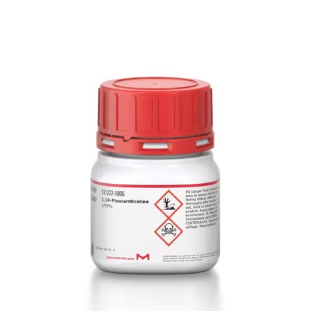 1,10-Phenanthroline is a white crystalline powder that acts as a bidentate ligand. It coordinates with metal ions through its two nitrogen atoms, forming highly stable Five-membered chelate rings. Its most famous application is the reaction with ferrous iron to form the intensely red-colored complex, known as ferroin. This property makes it the standard reagent for the colorimetric determination of iron and as a reversible redox indicator in titrimetry (e.g., cerimetry). Beyond analysis, it is used in coordination chemistry to study electron transfer and as a building block for supramolecular structures.